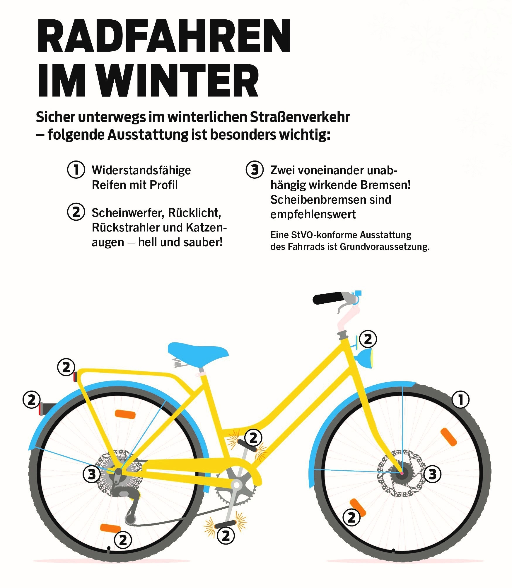 Um im winterlichen Straßenverkehr in der Stadt sicher voranzukommen, ist ein StVO-konform ausgestattetes Fahrrad Grundvoraussetzung. Besonders bei schlechter Witterung ist es außerdem wichtig, das Rad gründlich zu warten und zu reinigen: