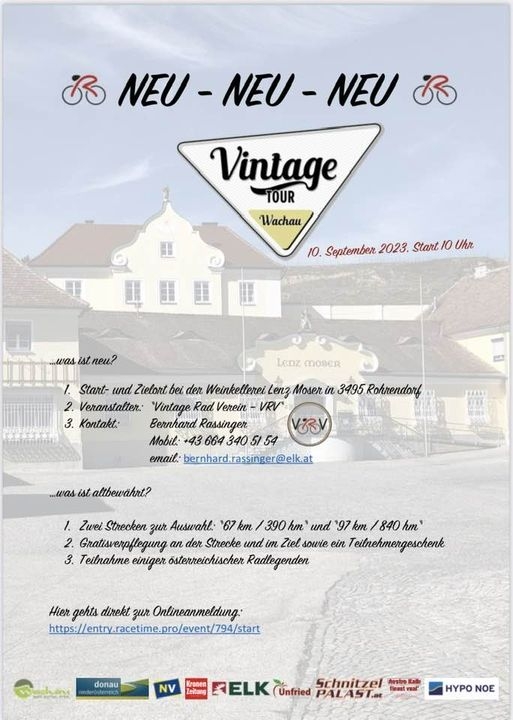 Die Vintage Tour in der Wachau kann heuer mit einigen Neuerungen aufwarten. So werden etwa Start und Ziel bei der Weinkellerei Lenz Moser in Rohrendorf stattfinden. Der von Bernhard Rassinger organisierte Event am 10. September 2023 lockt Fans der klassischen Rennräder zum Treffen mit heimischen Radlegenden.